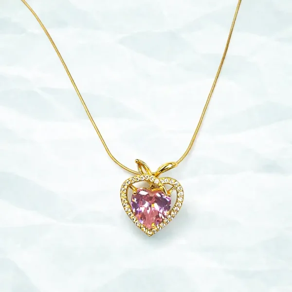 • Gold Plated Pink Heart Pendant Korean Necklace showcases a pink